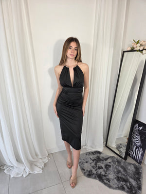 Abito longuette schiena scoperta, arricciatura sui fiancchi. Scollatura profonda e collana in accessorio oro.