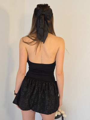 Abito corto con pantaloncino, scolatura profonda a V. Chiusura a bottoni. Coppe preformate. Schiena scoperta.