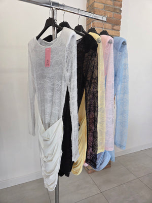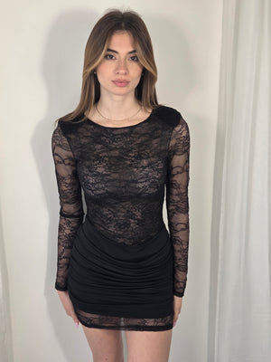 Abito mini in pizzo maniche lunghe, spalline imbottite, elasticizzato.