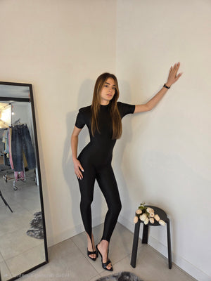 Jumpsuit intera aderente con le staffe e spalline imbottite. Chiusura con zip a scomparsa. Manica corta.