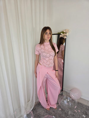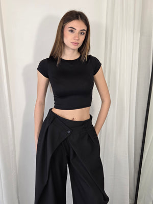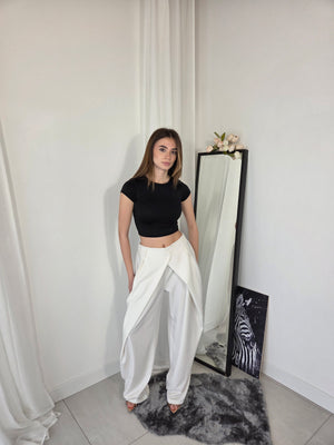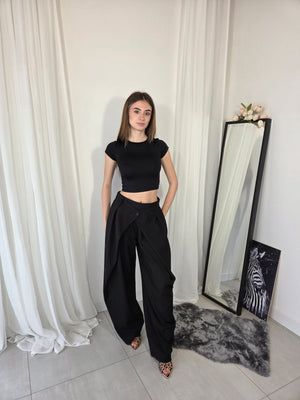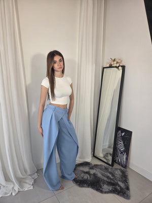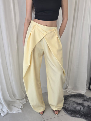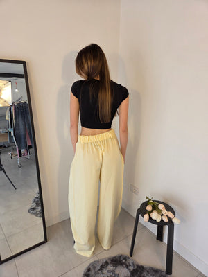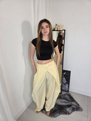 Pantalone sartoriale, doppia vita, stile balloon. Con elastico in vita e gamba ampia.